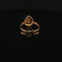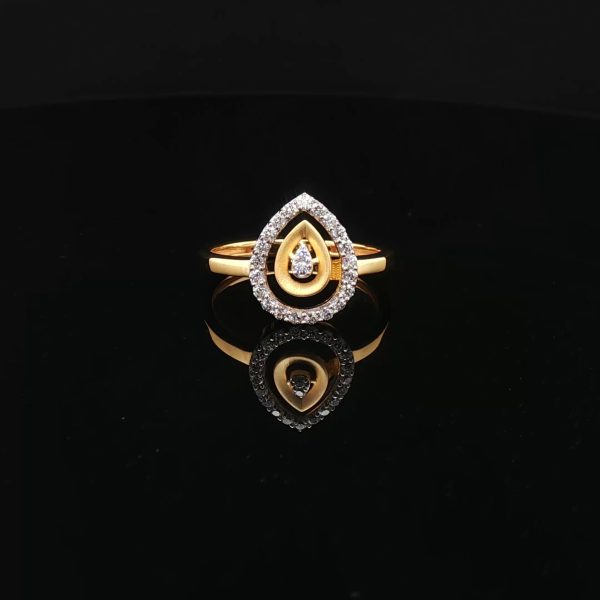 22K yellow gold teardrop multistone ring with pear-shaped CZ and halo accents. The graceful design exudes sophistication and luxury, making it a perfect statement piece for special occasions or adding refined sparkle to everyday style.