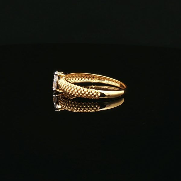 Elevate your style with this exquisite 22K yellow gold solitaire ring. The band features a unique textured design, while a captivating pear-cut cubic zirconia takes center stage. Its brilliant facets sparkle with every movement, creating a sophisticated statement piece for any occasion.